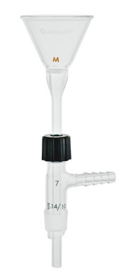 This Hirsch funnel has a 0.25 inch OD, 10 mm disc, and 4 inch long stem and is available with coarse or medium porosity. The complete kits come with an inlet adapter (MW-33-01) which allows the funnel to be connected to flasks or reaction vessels with 14/10 joints. The adapter also allows for vertical height adjustment of the funnel.