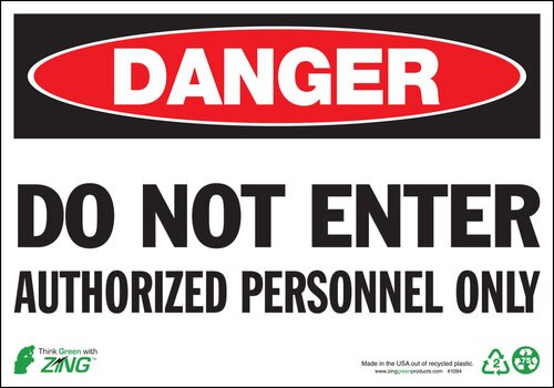 Zing Danger Do Not Enter Authorized Personnel Only Signs, 10" h x 14" w, Plastic and Vinyl Self-Adhesive