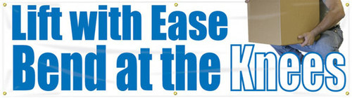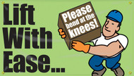This banner features a professional white background, the image of a worker lifting a box, and wording "Lift With Ease, Bend At The Knees" in bold white and blue text.