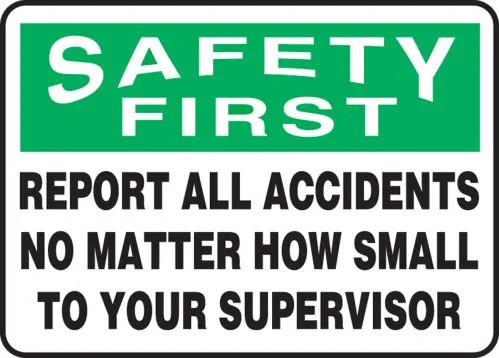These 14" w x 10" h signs feature a white-on-green, attention-grabbing, OSHA-style SAFETY FIRST header and black-on-white text that reads "REPORT ALL ACCIDENTS NO MATTER HOW SMALL TO YOUR SUPERVISOR". Use them to promote a culture of safety in your workplace.
