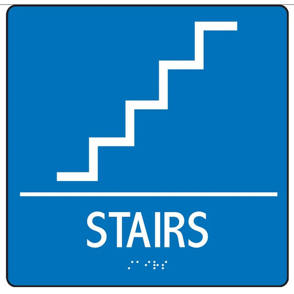 Designate all permanent rooms and spaces in a facility with these ADA certified Braille signs. This sign features the text "STAIRS" with the stairs icon. These signs are made from a single piece of injection-molded plastic that is 1/8” thick with color in the material to provide a non-glare surface and symbols. Graphic symbols and text use Grade 2 tactile braille raised 1/32”. The signs have radius corners and include double-faced foam tape for installation purposes. Available with white symbols on a blue or black background. These signs measure 8" x 8".