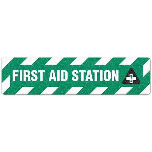 This Sign reads "First Aid Station" with accompanying graphic symbol. The white lettering on green background draws employees' attention to help improve safety in the workplace. These signs have an embossed resilient, anti-slip coating. They are easy to install on most any floor surface by removing the backing liner to expose the permanent adhesive backing.