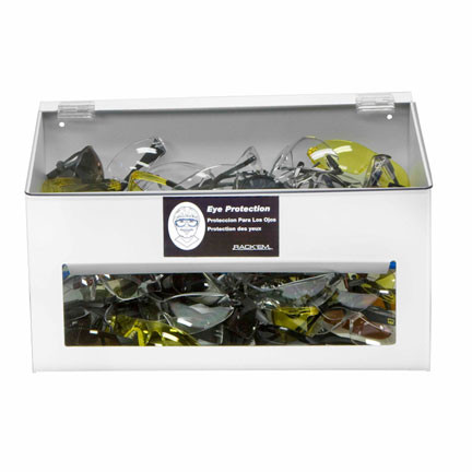 Be sure to keep your employees' vision safe by providing safety glasses for them. This item can hold up to 70 pairs of Safety Glasses. The clear top loading lid keeps your eye protection clean and protected. The front opening provides easy access to glasses. The unit comes without labels applied so that the end user can select the appropriate label for their application. It includes the following labels (stickers): Eye Protection, Blank Customizable White Label (that can be written on with pen, marker or self-adhesive laser printed labels). Illustrated labels have a caricature showing the item in use, and trilingual wording (English, Spanish, French Canadian) to insure worker compliance.