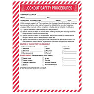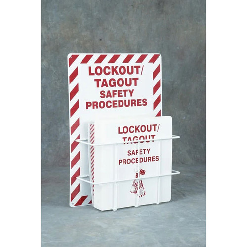 Ensure compliance with the OSHA Lockout/Tagout (LOTO) standard by centralizing your materials in this one location to document, track, and provide easy access for lockout/tagout procedures. The red and white, silk-screened polystyrene backboard measures 14"w x 20"h x .060" thick and has predrilled holes for easy wall mounting. A powder-coated steel wire rack attached to the front of the board holds a 1 1/2", 3-ring binder (included) in which to store lockout procedure forms (one package of 25 forms is included).