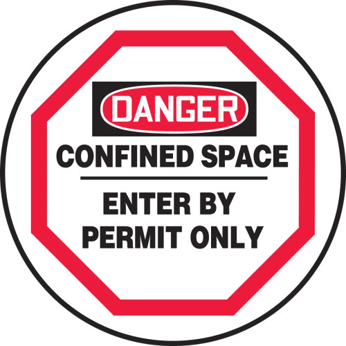 This eye-catching white, red, and black 17" (43.2 cm) diameter manhole sign, features a red octangle and inside has the OSHA Danger header, and the text "Confined Space | Enter By Permit Only".