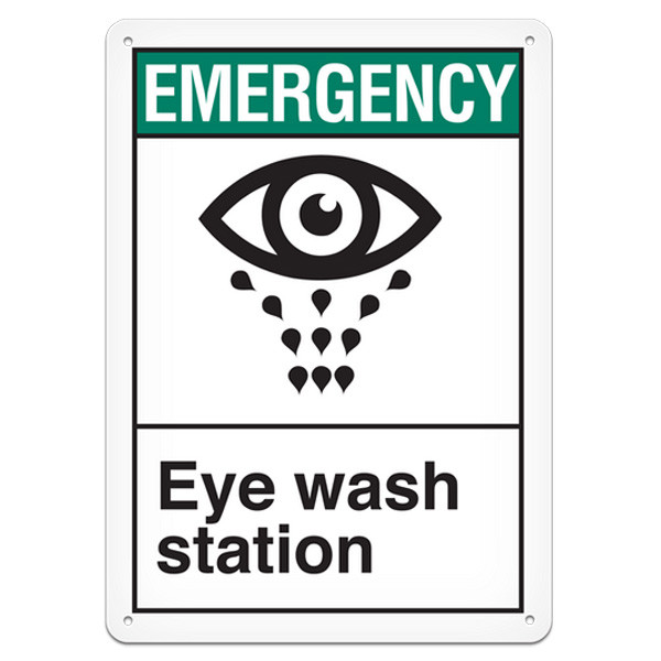 These 10" w x 14" h ANSI-style signs are used to clearly identify the location of your eye was stattions. The EMERGENCY header and large eye being washed graphic image grab the eye and the text reads "Eye wash station."