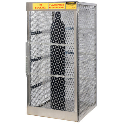 This Justrite 10-cylinder vertical compressed gas cylinder locker features 100% welded aluminum construction that won't leak, corrode, or discolor. The expanded .065" (1.65 mm) metal panels are the strongest in the industry, offering additional resistance to tampering. A welded security lug on the front panel door accepts a padlock (not included) for extra protection. The heavier gauge aluminum mesh and extruded (not bent) frame add rigidity and the solid roof panel slants back to shed water and ice. These cylinder lockers ship fully assembled for instant setup.