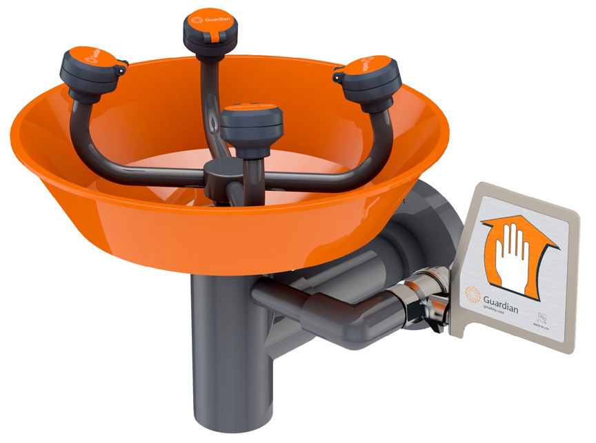 The Guardian Equipment G1790 is a constructed entirely of PVC, has a stainless steel valve for superior corrosion resistance, and comes in your choice of orange, yellow, and green. The G1780 is similar but uses two larger FS-Plus™ spray heads to wash the eyes and face. The G1890 is also similar but has two smaller GS-Plus™ spray heads which wash only the eyes. Various wall and pedestal-mounted versions are available as well as additional corrosion-resistant and ADA-compliant models.