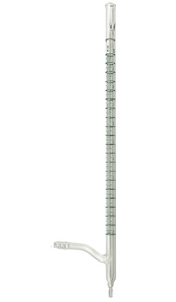 Soap bubbler flow meters are a classic method for measuring the gas flow rate for carrier gases in applications such as gas chromatography (GC). The unit is supplied with a rubber bulb which attaches to the bottom of the device. The outlet of the system to be measured is connected to the serrated hose connection (9 mm O.D. at the middle ring, 10 mm O.D. at the largest ring), and the bulb is partially filled with soapy water.