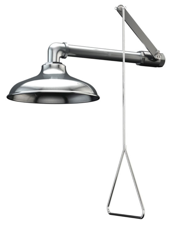 The Guardian Equipment G1691 shower is horizontally mounted from the wall. The unit is activated by pulling on the solid pull rod and the shower valve stays open until the pull rod is manually pushed up. If you don't need all-stainless construction, the G1643 is similar in most respects. The G1696 is another all-stainless option if you need a free-standing shower where wall mounting is not feasible.