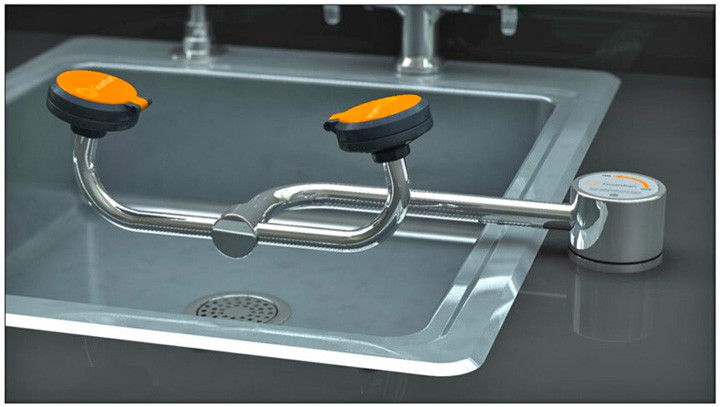 The Guardian Equipment G1774 eyewash mounts on the countertop to the side of your existing sink and swivels out of the way when not needed. Available in right and left-handed configurations; sink is not included. Similar models are the G1778 which mounts to the wall behind the sink, and the G1779 which mounts on the deck behind the sink.